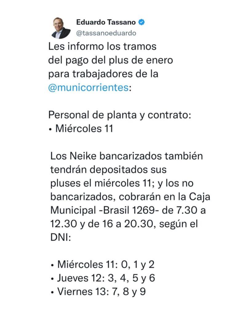 | Este miércoles 11, la Municipalidad de Corrientes iniciará el pago del plus de enero para todo el personal, según informó el intendente Eduardo Tassano. Los trabajadores de planta y contrato y los agentes Neike bancarizados tendrán depositados los pluses en sus respectivas cuentas bancarias el miércoles 11, dinero al que podrán acceder extrayéndolo a través de los cajeros automáticos habilitados. Por su parte, aquellos trabajadores Neike que no están bancarizados deberán dirigirse a la Caja Municipal de Préstamos (CMP), en su sede central, ubicada en Brasil 1269. Los pagos se realizan de lunes a viernes, de 7.30 a 12.30 y de 16 a 20.30. En este caso, este miércoles 11 les corresponderá cobrar a los trabajadores cuyos DNI terminen en 0, 1 y 2; el jueves 12, a los agentes con DNI finalizados en 3, 4, 5 y 6; y el viernes 13, a los que tengan documentos que culminen en 7, 8 y 9. |